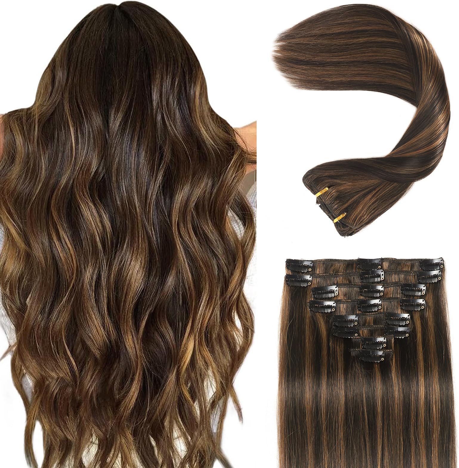 WENNALIFE Invisi Edge Clip in Hair Extensions Real Human Hair, 18 Inch 130g 7pcs Balayage Chocolate Brown to Caramel Blond...